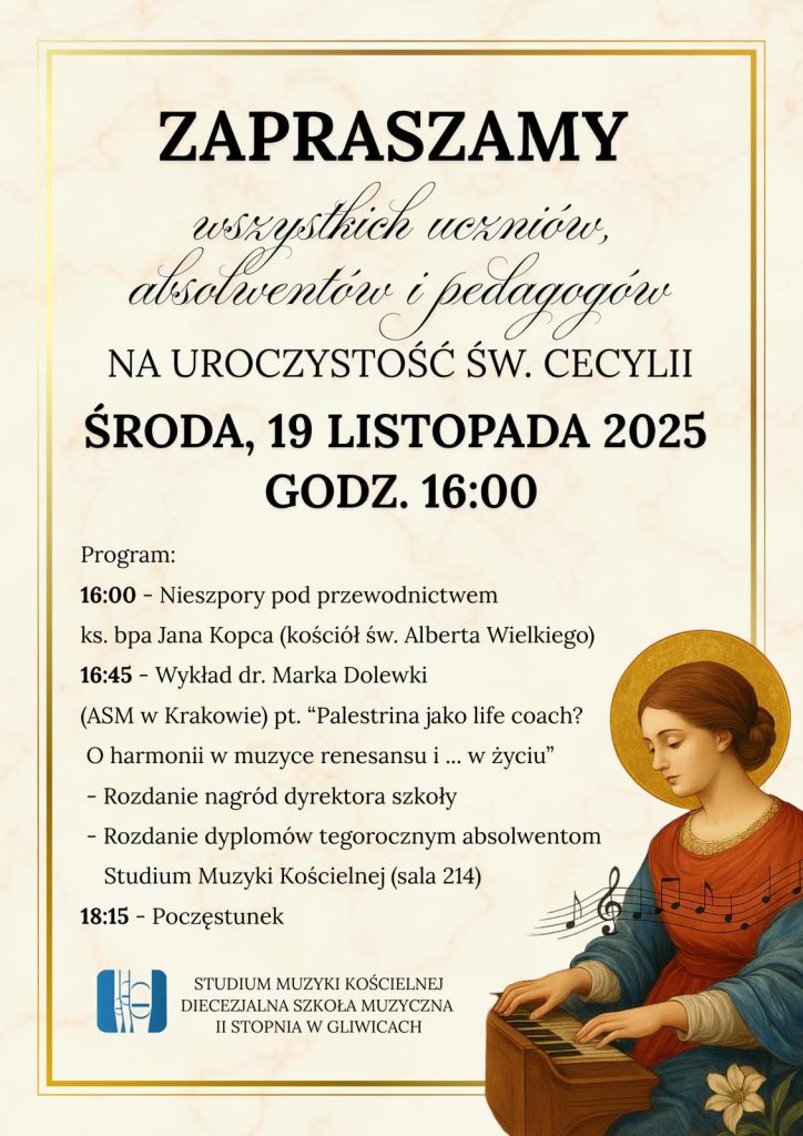 Serdecznie zapraszamy na wspólne świętowanie wspomnienia naszej patronki św. Cecylii. Poprzedni artykuł