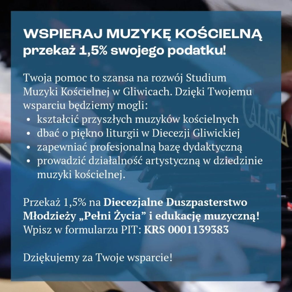Wasz 1,5% podatku to inwestycja w piękno liturgii! Przekazując te środki na Studium Muzyki Kościelnej, wspieracie edukację przyszłych organistów, warsztaty śpiewu gregoriańskiego i dbałość o kulturę muzyczną w naszych kościołach.